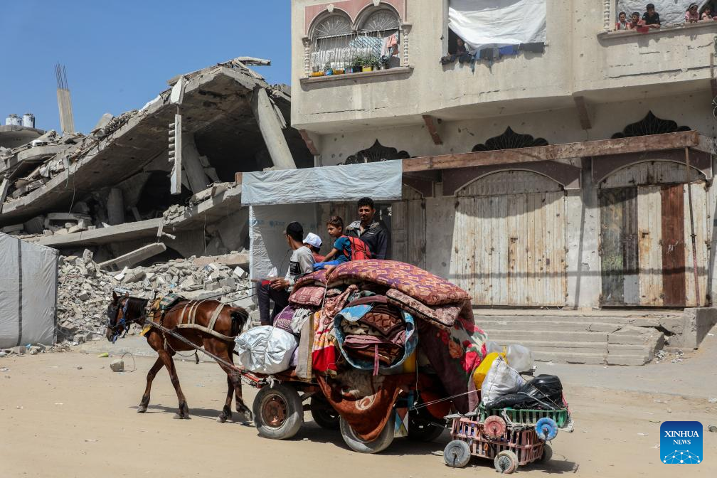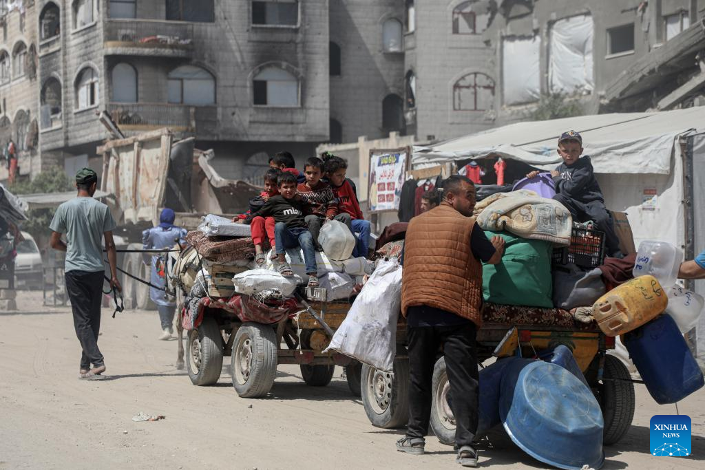 Displaced Palestinians are seen in Gaza City, as they flee with their belongings from Beit Lahia or Jabalia in northern Gaza Strip, on May 16, 2025. (Photo by Rizek Abdeljawad/Xinhua)