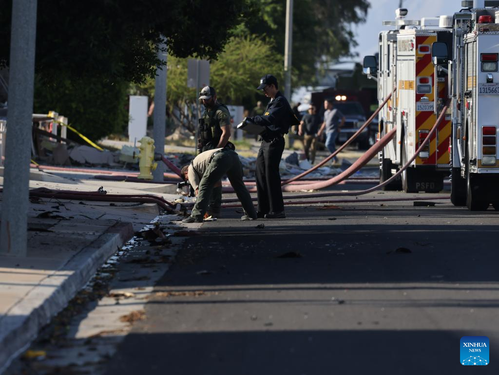 Authorities investigate near the site of an explosion in Palm Springs, California, the United States, on May 17, 2025. At least one person was killed and five others injured on Saturday in an explosion outside a fertility clinic in the desert resort city of Palm Springs, California, according to authorities. (Photo by Qiu Chen/Xinhua)