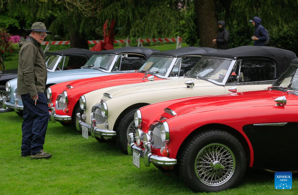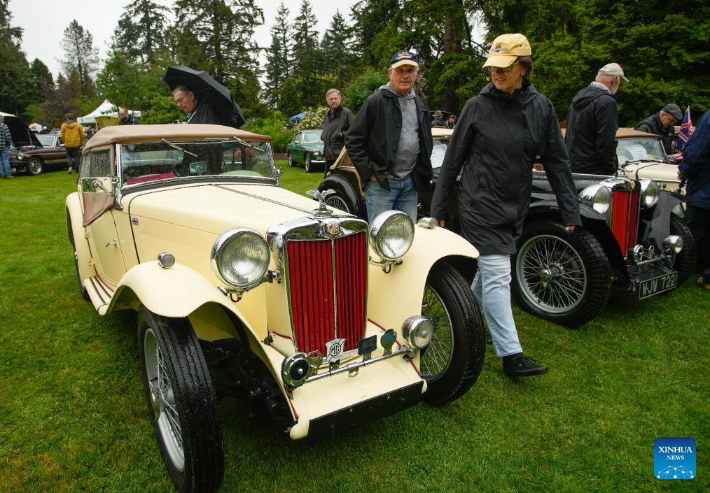 People view classic cars displayed during the 2025 Vancouver All British Field Meet classic car show at VanDusen Botanical Garden in Vancouver, British Columbia, Canada, May 17, 2025. The annual event featured over 400 classic British vehicles, attracting car enthusiasts and collectors from across the region. (Photo by Liang Sen/Xinhua)