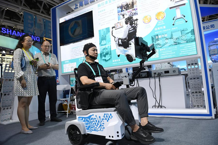 A staff member demonstrates how to use a rehabilitation wheelchair during the 9th Silk Road International Exposition and the Investment and Trade Forum for Cooperation between East & West China in Xi'an, northwest China's Shaanxi Province, May 21, 2025. (Xinhua/Li Yibo)