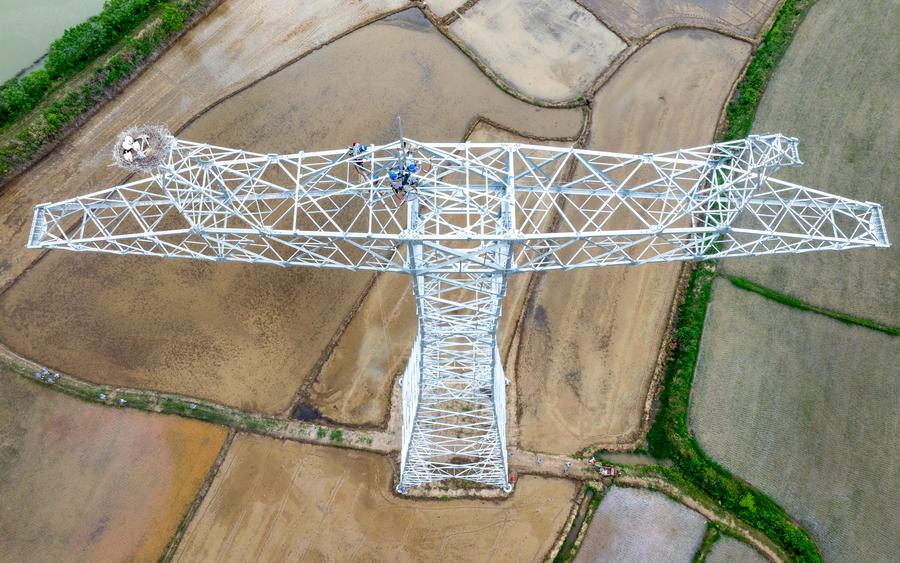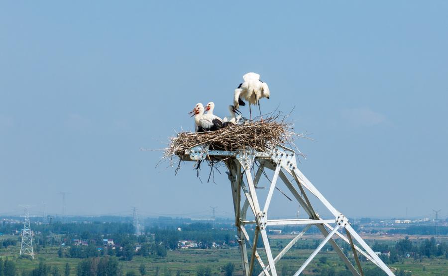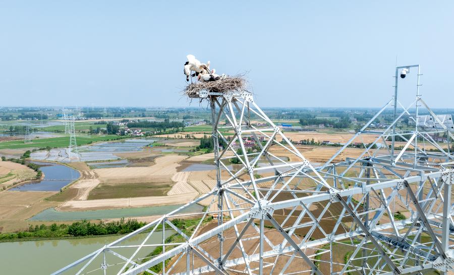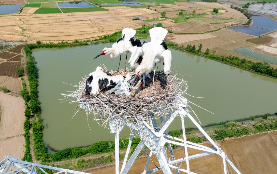 An aerial drone photo taken on May 21, 2025 shows an oriental white stork taking care of the nestlings on top of a transmission tower in Huoqiu County, east China's Anhui Province.(Photo by Zheng Xianlie/Xinhua)An aerial drone photo taken on May 20, 2025 shows a nest of oriental white storks on a transmission tower in Huoqiu County, east China's Anhui Province. (Photo by Zheng Xianlie/Xinhua)An oriental white stork perches on top of a transmission tower in Huoqiu County, east China's Anhui Province, May 20, 2025. (Xinhua/Zhou Mu)An aerial drone photo taken on May 21, 2025 shows oriental white storks taking care of the nestlings on top of a transmission tower in Huoqiu County, east China's Anhui Province. (Xinhua/Zhou Mu)An aerial drone photo taken on May 20, 2025 shows workers of State Grid Anhui Electric Power Co., Ltd. installing a camera near the nest of oriental white storks in Huoqiu County, east China's Anhui Province. (Photo by Zhao Xianfu/Xinhua)An aerial drone photo taken on May 20, 2025 shows workers of State Grid Anhui Electric Power Co., Ltd. installing a camera near the nest of oriental white storks in Huoqiu County, east China's Anhui Province. (Photo by Zhao Xianfu/Xinhua)An aerial drone photo taken on May 20, 2025 shows workers of State Grid Anhui Electric Power Co., Ltd. installing a camera near the nest of oriental white storks in Huoqiu County, east China's Anhui Province. (Photo by Zheng Xianlie/Xinhua)Workers of State Grid Anhui Electric Power Co., Ltd. install a camera near the nest of oriental white storks in Huoqiu County, east China's Anhui Province, May 20, 2025. (Xinhua/Zhou Mu)An aerial drone photo taken on May 21, 2025 shows oriental white storks taking care of the nestlings on top of a transmission tower in Huoqiu County, east China's Anhui Province. (Xinhua/Zhou Mu)An aerial drone photo taken on May 21, 2025 shows oriental white storks taking care of the nestlings on top of a transmission tower in Huoqiu County, east China's Anhui Province. (Xinhua/Zhou Mu)