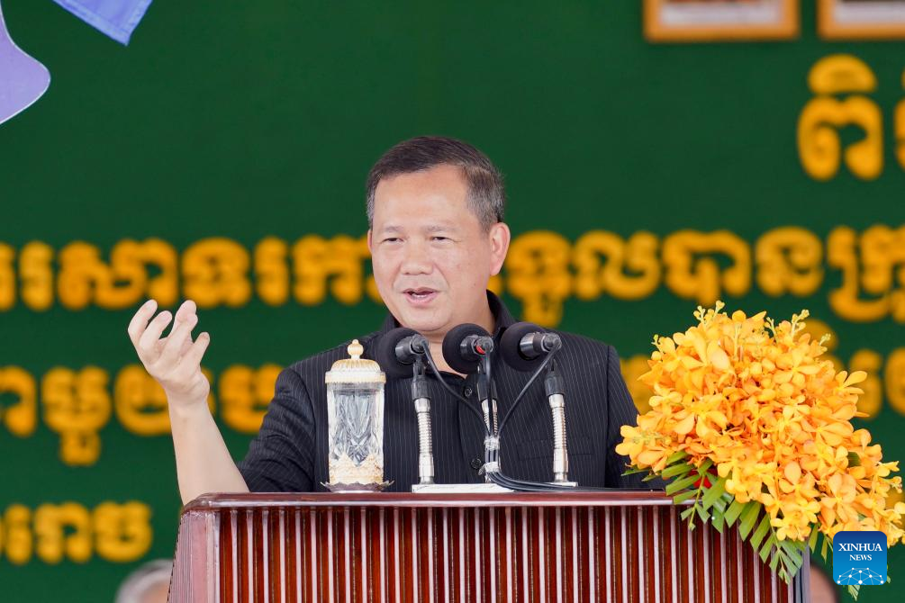Cambodian Prime Minister Hun Manet speaks at the Sihanoukville Special Economy Zone (SSEZ) in Sihanoukville, Cambodia, May 22, 2025. (Photo by Nitola/Xinhua)