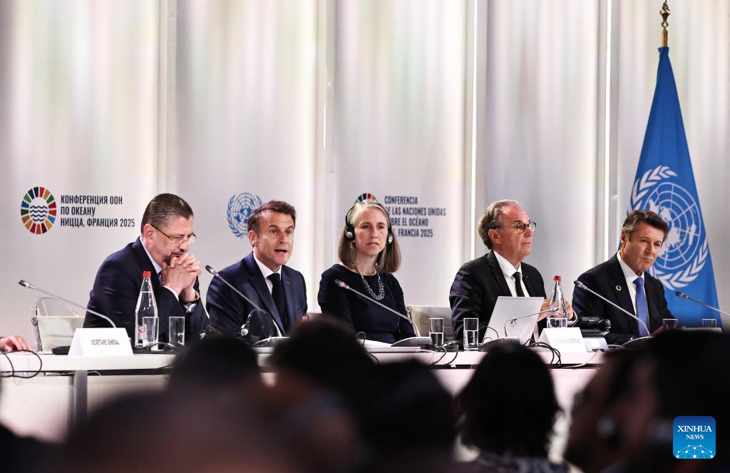 French President Emmanuel Macron (3rd R) addresses the opening session of the third United Nations Ocean Conference (UNOC3) in Nice, France, June 9, 2025. The third United Nations Ocean Conference (UNOC3) opened on Monday in Nice, a coastal city in southern France, under the theme of "Accelerating action and mobilizing all actors to conserve and sustainably use the ocean". (Xinhua/Gao Jing)