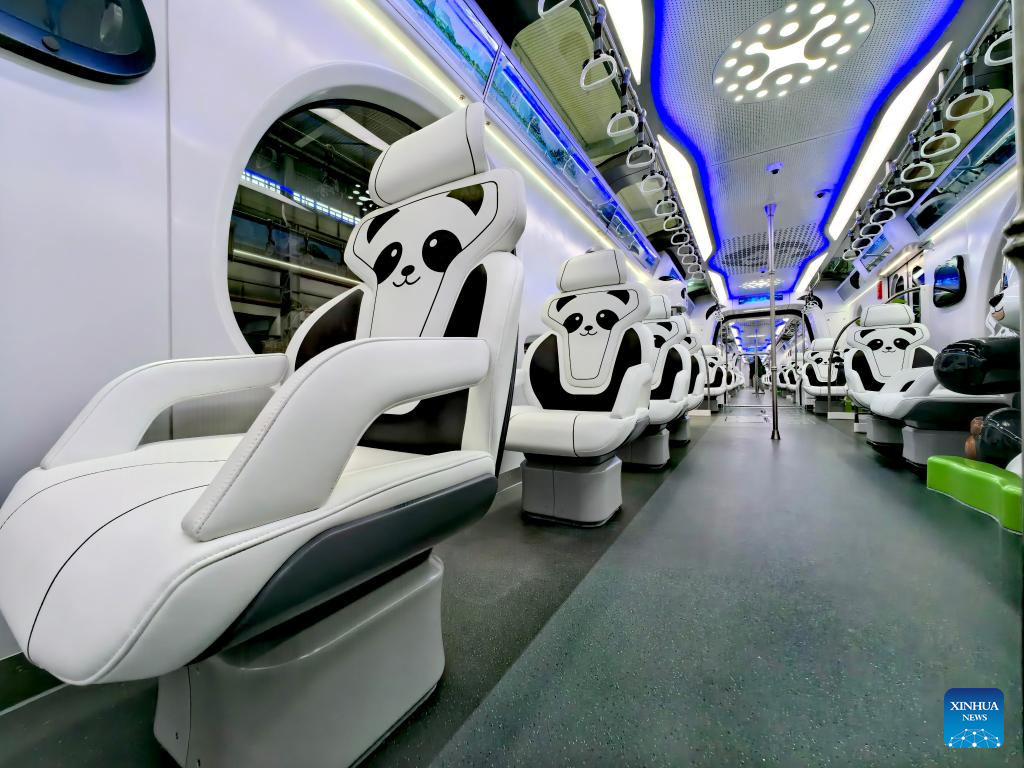 At a base of Chongqing Rail Transit (Group) Co., Ltd. in Tongjiayuanzi, the train instantly captivates with its exterior artistry -- minimalist black lines contour a plump panda face on the train head, while it has adorable panda designs on both sides of its streamlined body, along with large panoramic windows and a skylight in the roof.