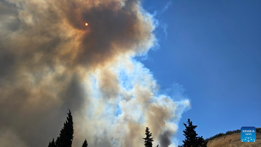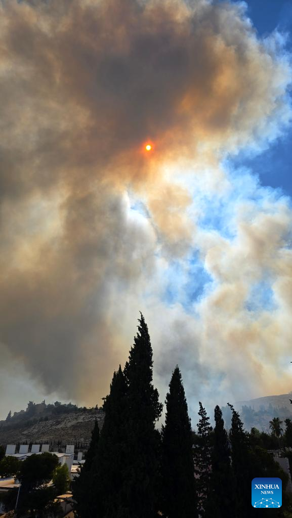 Smoke rises as a result of a fire that erupted near the Syrian al-Shaab presidential palace in Damascus, Syria, July 4, 2025. Unknown fire erupted Friday afternoon in bushes close to the Syrian al-Shaab presidential palace situated on top of a mountain overlooking the capital Damascus, sending thick plums of black smoke over wide areas, local media and witnesses said. (Photo by Hummam Sheikh Ali/Xinhua)