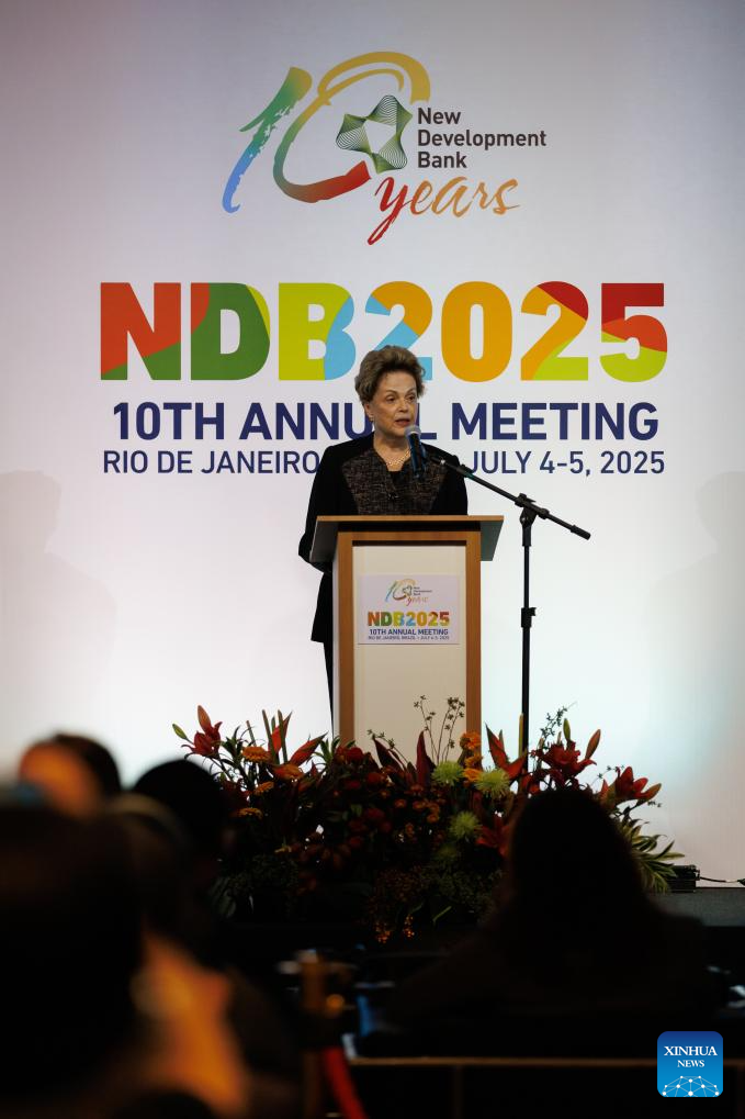 Dilma Rousseff, former president of Brazil and president of the New Development Bank (NDB), speaks during the 10th NDB Annual Meeting in Rio De Janeiro, Brazil, July 4, 2025. (Photo by Claudia Martini/Xinhua)
