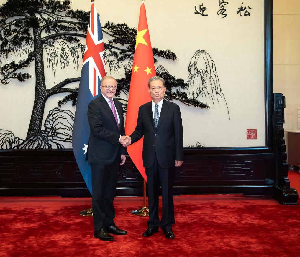 Zhao Leji, chairman of the National People's Congress (NPC) Standing Committee, meets with Australian Prime Minister Anthony Albanese in Beijing, capital of China, July 15, 2025. (Xinhua/Li Tao)