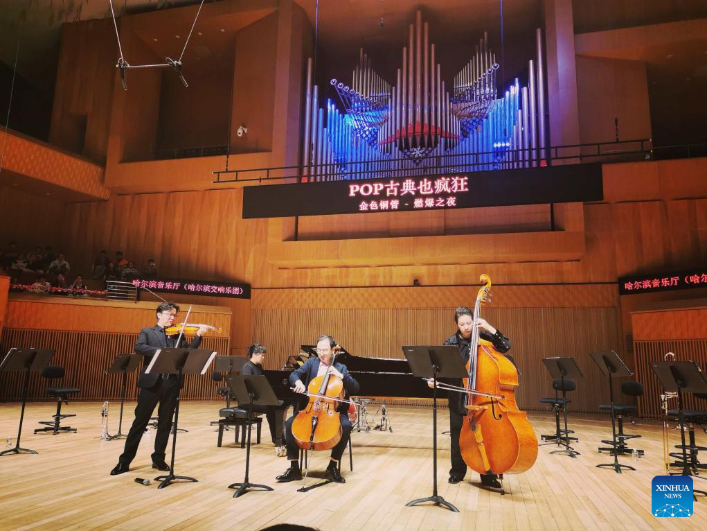 Violinist Lee Tien-hsuan (1st L) performs during a concert at Harbin Concert Hall in Harbin, northeast China's Heilongjiang Province, May 5, 2024.(Harbin Concert Hall/Handout via Xinhua)