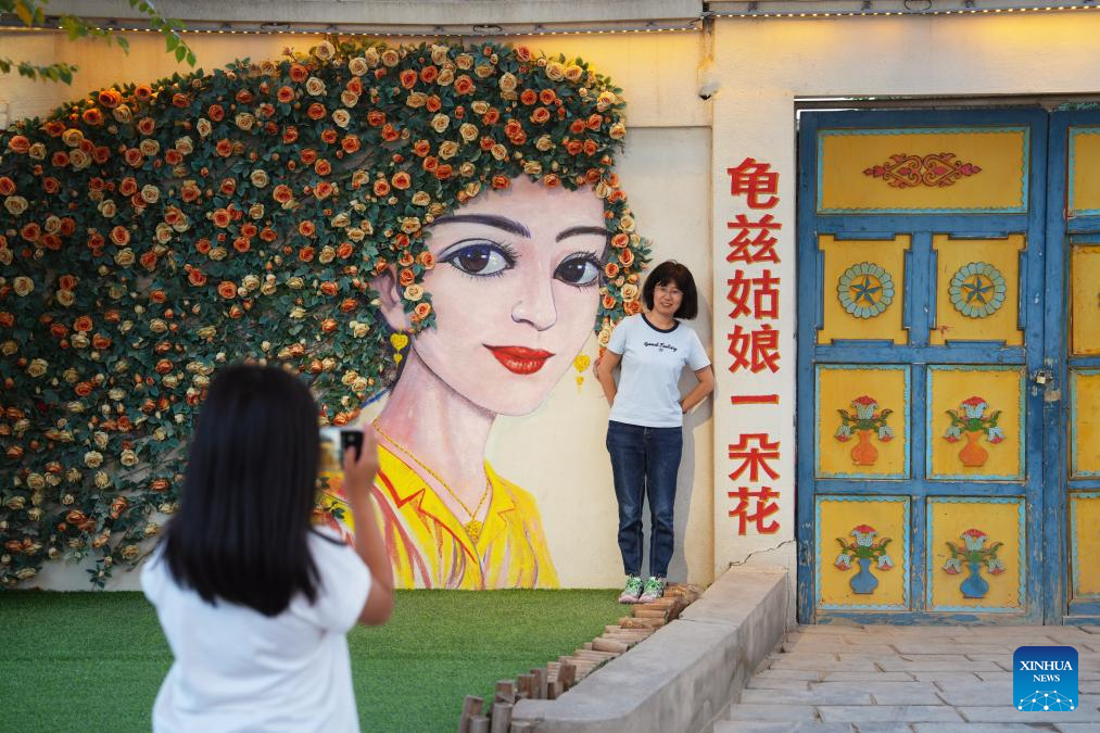 A tourist poses for a photo at the Qiuci Alley in Kuqa City, northwest China's Xinjiang Uygur Autonomous Region, on July 17, 2025. Kuqa City in recent years has continuously renovated and upgraded the Qiuci Alley ("Qiuci" is a Chinese pinyin form of Kuqa), which sits at the core area of the city. While retaining the original layout of the historical street, the renovation aimed to improve the habitat environment and enrich tourists' experience. (Xinhua/Li Xiao)