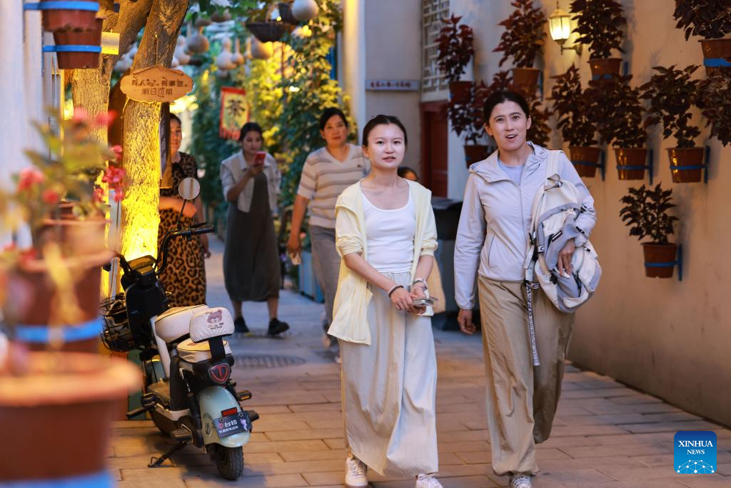 Tourists walk at the Qiuci Alley in Kuqa City, northwest China's Xinjiang Uygur Autonomous Region, on July 17, 2025. Kuqa City in recent years has continuously renovated and upgraded the Qiuci Alley ("Qiuci" is a Chinese pinyin form of Kuqa), which sits at the core area of the city. While retaining the original layout of the historical street, the renovation aimed to improve the habitat environment and enrich tourists' experience. (Xinhua/Meng Tao)