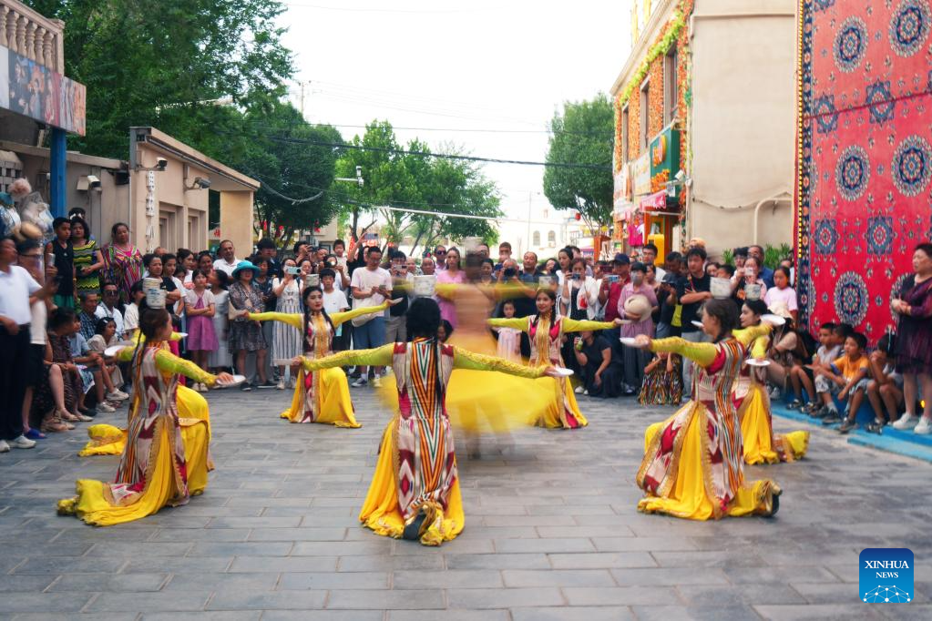 Tourists enjoy a bowl dance performance at the Qiuci Alley in Kuqa City, northwest China's Xinjiang Uygur Autonomous Region, on July 17, 2025. Kuqa City in recent years has continuously renovated and upgraded the Qiuci Alley ("Qiuci" is a Chinese pinyin form of Kuqa), which sits at the core area of the city. While retaining the original layout of the historical street, the renovation aimed to improve the habitat environment and enrich tourists' experience. (Xinhua/Hu Huhu)
