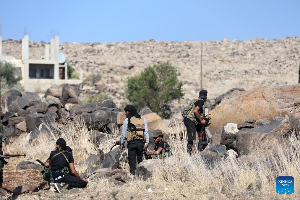 Tribal fighters take positions during clashes in the town of Wolgha, western countryside of Sweida, southern Syria, on July 18, 2025. The Syrian interim authorities on Friday issued a call for restraint amid escalating violence in the southern province of Sweida, pledging to deploy forces to contain the conflict. (Str/Xinhua)