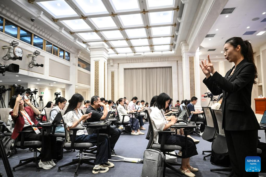 A sign language interpreter (1st R) and media professionals work at a press conference held by the State Council Information Office (SCIO) in Beijing, capital of China, July 22, 2025. Cheng Kai, chairman of the China Disabled Persons' Federation, Zhou Changkui, secretary of the Communist Party of China leading group of the federation and chairperson of the board of executive directors of the federation, and Li Dongmei, vice chairperson of the federation, attended a press conference held by the State Council Information Office on the achievements in developing the cause of people with disabilities during the 14th Five-Year Plan period (2021-2025) in Beijing on Tuesday. (Xinhua/Chen Yehua)