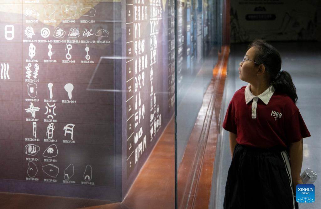 A girl visits Yinchuan World Rock Art Museum in Yinchuan, northwest China's Ningxia Hui Autonomous Region, July 23, 2025. Helan Mountain is noted for more than 20,000 cliff paintings and carvings created by the nomads that once lived in northern China. These works depict herding, hunting, sacrificial rites and the lives of the people who lived 3,000 to 10,000 years ago. Images of animals dominate, followed by humans, vehicles, plants, planets, fingerprints and abstract signs.