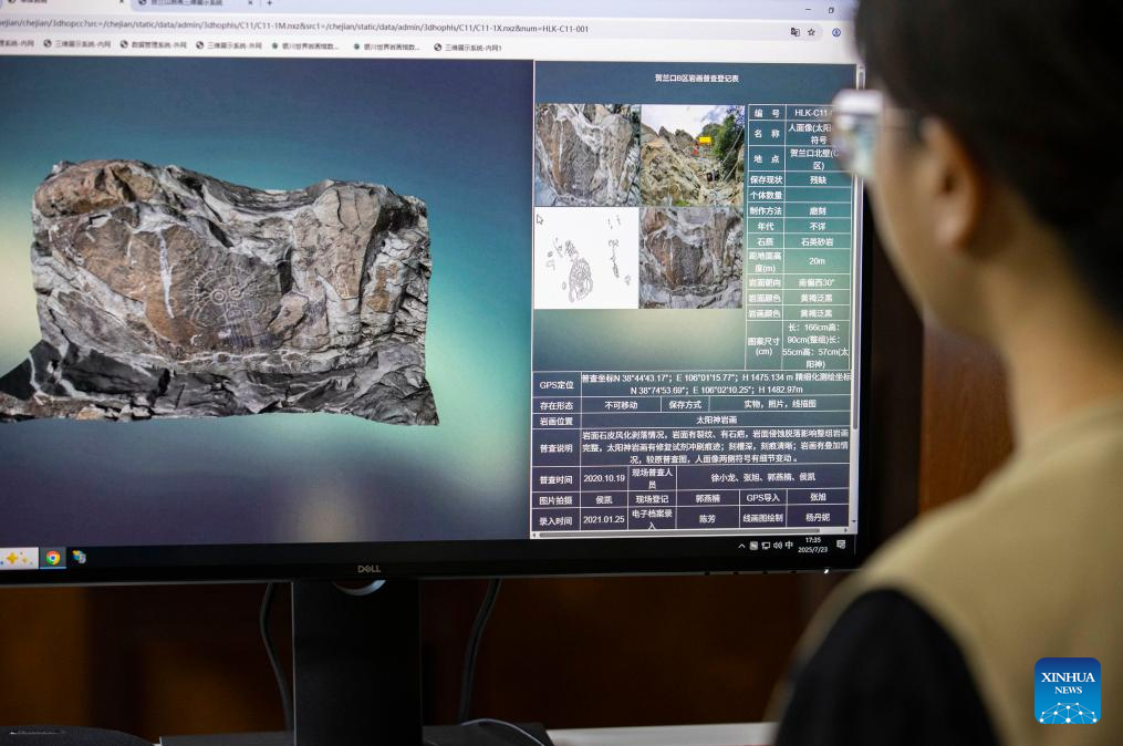 A staff member operates multi-source digital management platform for Helan Mountain cliff paintings in Yinchuan, northwest China's Ningxia Hui Autonomous Region, July 23, 2025. Helan Mountain is noted for more than 20,000 cliff paintings and carvings created by the nomads that once lived in northern China. These works depict herding, hunting, sacrificial rites and the lives of the people who lived 3,000 to 10,000 years ago. Images of animals dominate, followed by humans, vehicles, plants, planets, fingerprints and abstract signs.