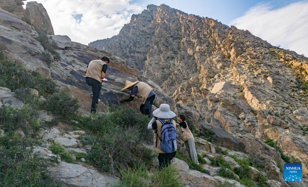 A drone photo taken on July 23, 2025 shows staff members examining a cliff painting at Helan Mountain rock painting scenic spot in Yinchuan, northwest China's Ningxia Hui Autonomous Region. Helan Mountain is noted for more than 20,000 cliff paintings and carvings created by the nomads that once lived in northern China. These works depict herding, hunting, sacrificial rites and the lives of the people who lived 3,000 to 10,000 years ago. Images of animals dominate, followed by humans, vehicles, plants, planets, fingerprints and abstract signs.