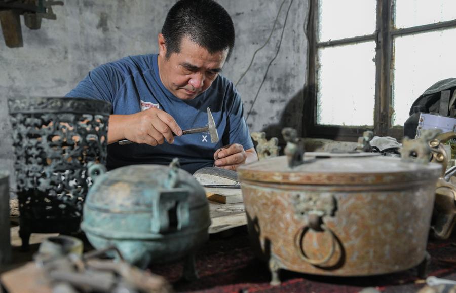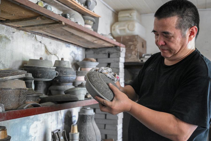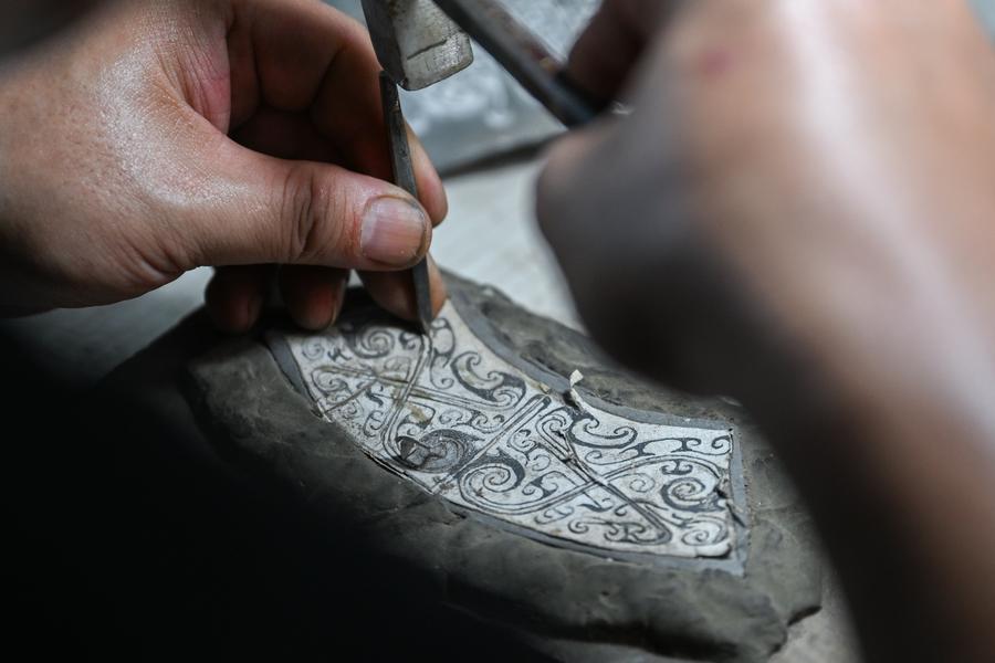 JINGZHOU, Aug. 30 (Xinhua) -- Lead-Tin Engraving, a mould-making craft used to create and replicate bronze ware, is known for its excellent work in reproducing the fine and exquisite patterns on ancient bronze ware. Mixing tin into lead to get a softer texture for making a mould, the craft can create both 2D and 3D patterns. The making of a bronze ware roughly goes through procedures like pattern designing, mud mould making, lead-tin mould making, engraving, molten copper pouring and grinding. In 2001, the craft of Lead-Tin Engraving was listed as one of the national-level intangible cultural heritages.