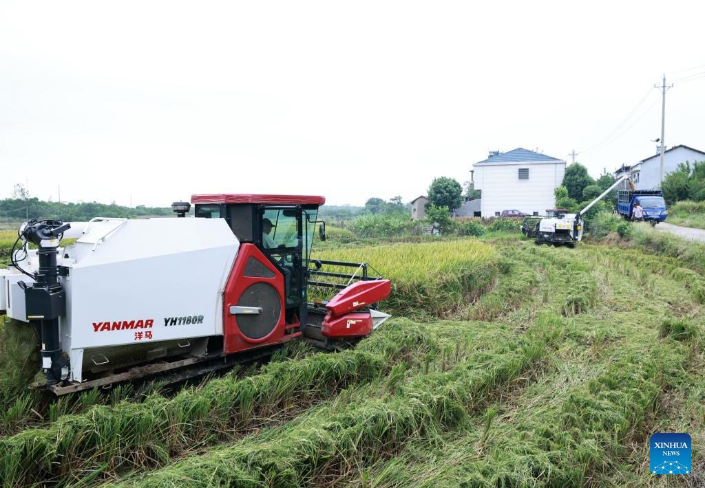 Farmers harvest rice at a farm in Wuhan, central China's Hubei Province, Sept. 6, 2025. White Dew, a solar term meaning dew curdles and it starts to get cold, falls on Sept. 7 this year. (Photo by Zhao Jun/Xinhua)