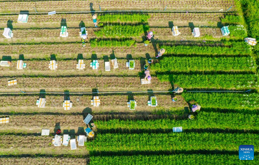 An aerial drone photo taken on Sept. 4, 2025 shows farmers harvesting chives in a field in Qingguang Village of Ganzhou City, east China's Jiangxi Province. White Dew, a solar term meaning dew curdles and it starts to get cold, falls on Sept. 7 this year. (Photo by Li Jian/Xinhua)