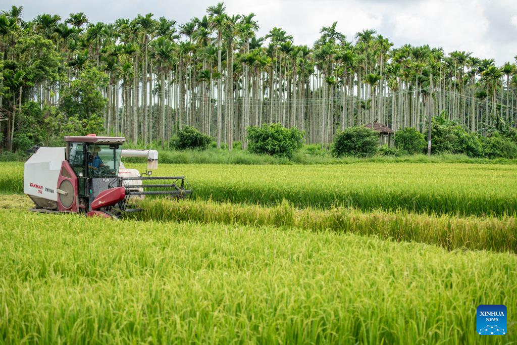 A farmer harvests rice with a reaper in a field in Qionghai City, south China's Hainan Province, Sept. 5, 2025. White Dew, a solar term meaning dew curdles and it starts to get cold, falls on Sept. 7 this year. (Photo by Meng Zhongde/Xinhua)