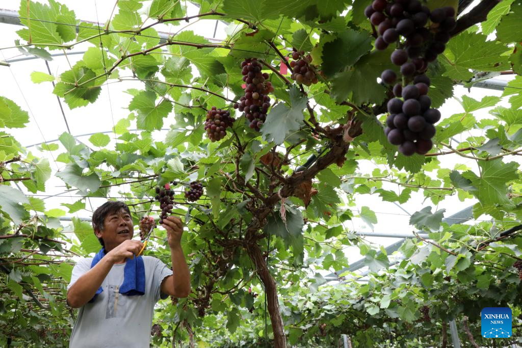 A farmer picks grapes in Jiaoji Village, Binzhou City of east China's Shandong Province, Sept. 6, 2025. White Dew, a solar term meaning dew curdles and it starts to get cold, falls on Sept. 7 this year. (Photo by Chen Bin/Xinhua)