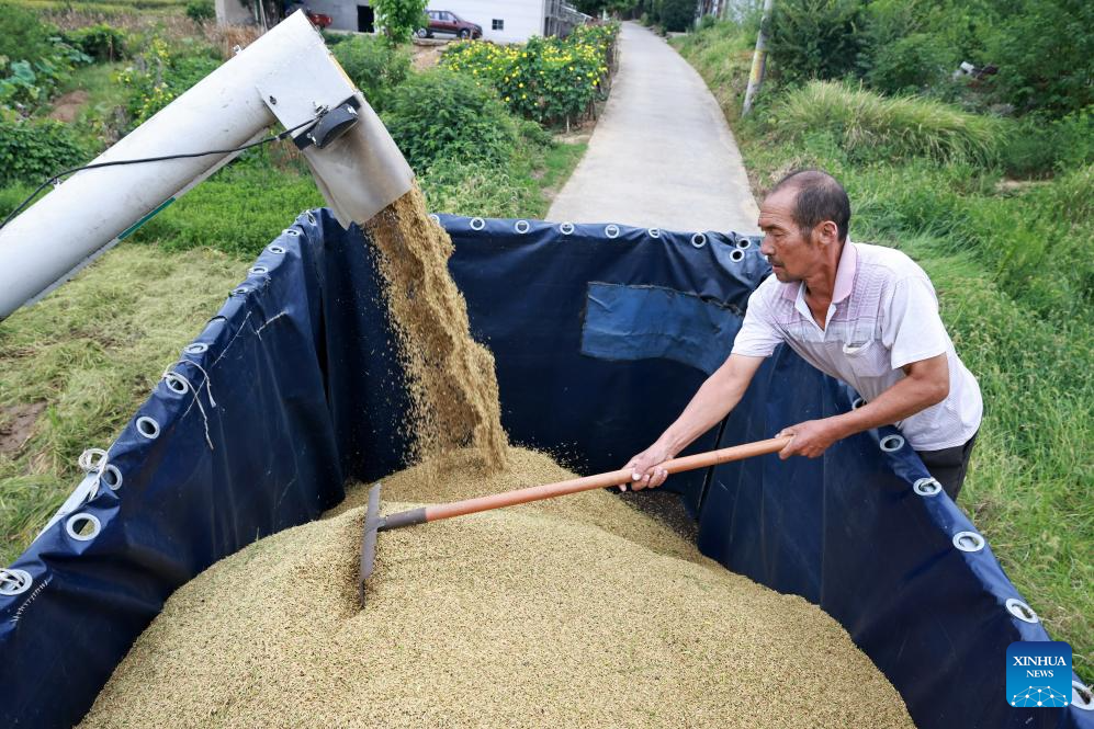 A farmer checks harvested rice in a field in Taiyang Village, Dazhou City of southwest China's Sichuan Province, Sept. 4, 2025. White Dew, a solar term meaning dew curdles and it starts to get cold, falls on Sept. 7 this year. (Photo by Deng Liangkui/Xinhua)