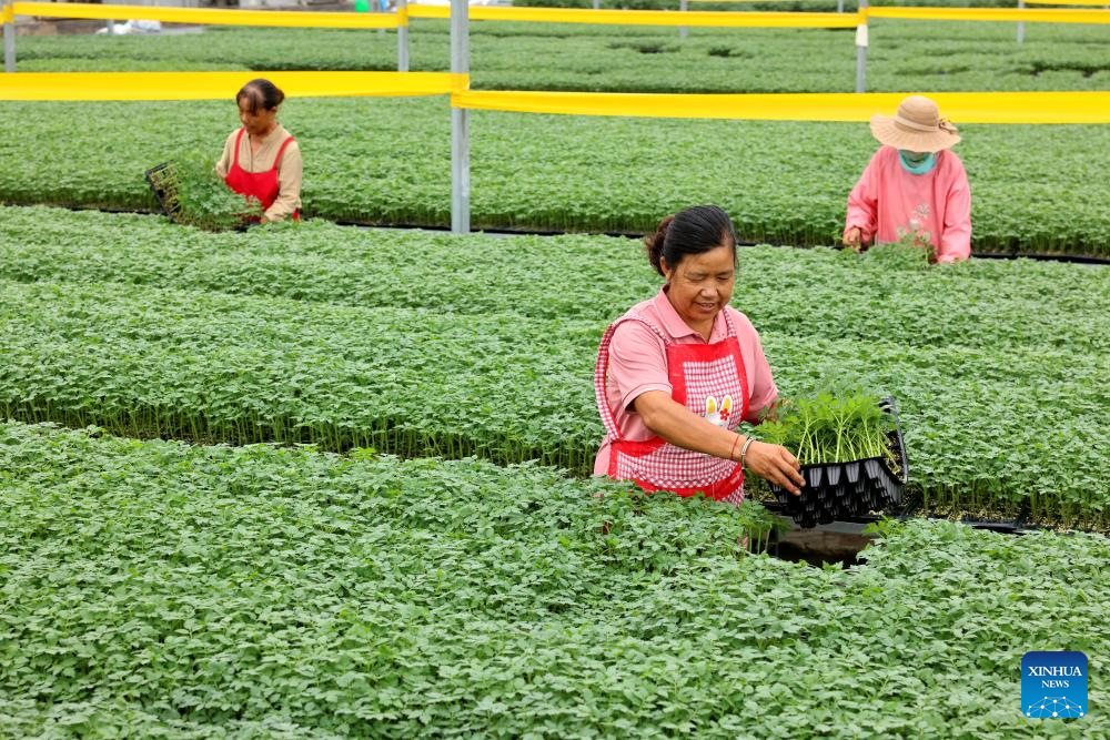 Farmers tend vegetable at a vegetable base in Xiwangzhuang Town, Zaozhuang City of east China's Shandong Province, Sept. 6, 2025. White Dew, a solar term meaning dew curdles and it starts to get cold, falls on Sept. 7 this year. (Photo by Sun Zhongzhe/Xinhua)