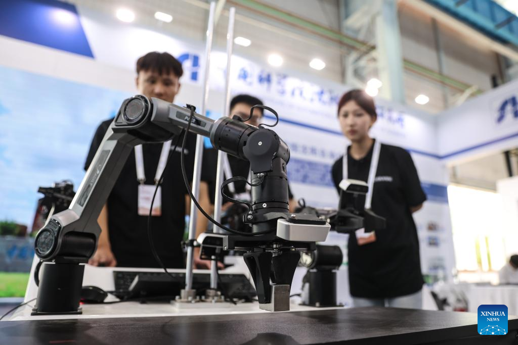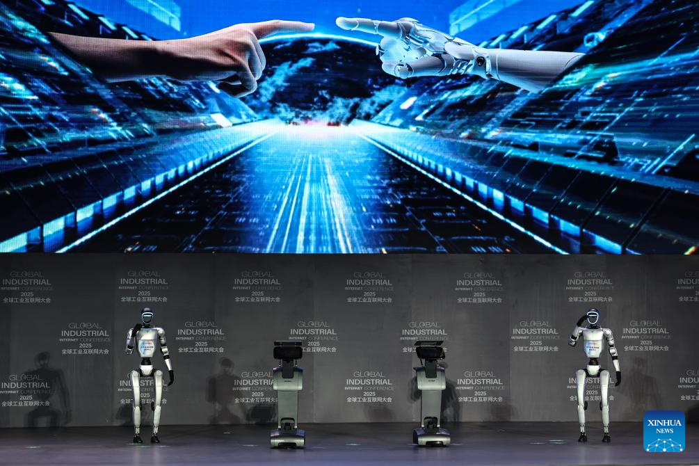 Industrial robots are displayed at the exhibition area of the 2025 Global Industrial Internet Conference in Shenyang, northeast China's Liaoning Province, Sept. 6, 2025. Themed "Digital New Chapter, Intelligent New Quality," the 2025 Global Industrial Internet Conference kicked off here on Saturday and will last till Sept. 8. (Xinhua/Pan Yulong)
