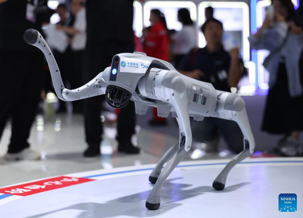 A robot dog is displayed at the exhibition area of the 2025 Global Industrial Internet Conference in Shenyang, northeast China's Liaoning Province, Sept. 6, 2025. Themed "Digital New Chapter, Intelligent New Quality," the 2025 Global Industrial Internet Conference kicked off here on Saturday and will last till Sept. 8. (Xinhua/Yang Qing)