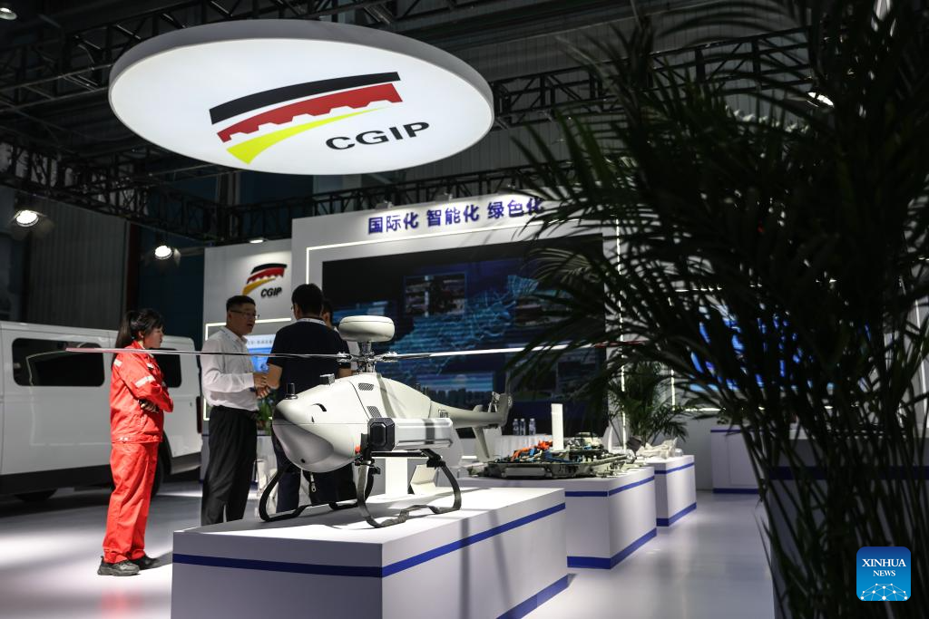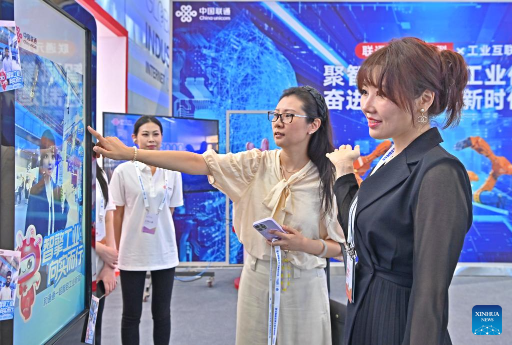 People visit the exhibition area of the 2025 Global Industrial Internet Conference in Shenyang, northeast China's Liaoning Province, Sept. 6, 2025. Themed "Digital New Chapter, Intelligent New Quality," the 2025 Global Industrial Internet Conference kicked off here on Saturday and will last till Sept. 8. (Xinhua/Pan Yulong)
