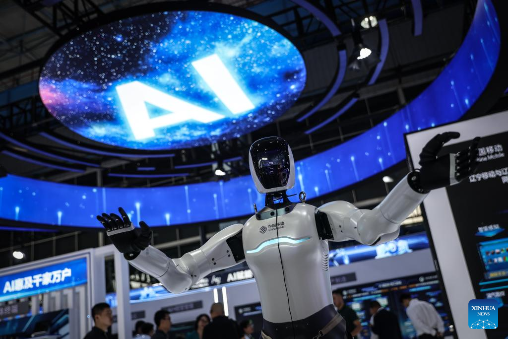 A humanoid robot of China Mobile is pictured at the exhibition area of the 2025 Global Industrial Internet Conference in Shenyang, northeast China's Liaoning Province, Sept. 7, 2025. Themed "Digital New Chapter, Intelligent New Quality," the 2025 Global Industrial Internet Conference kicked off here on Saturday and will last till Sept. 8. (Photo by Wang Yuyan/Xinhua)
