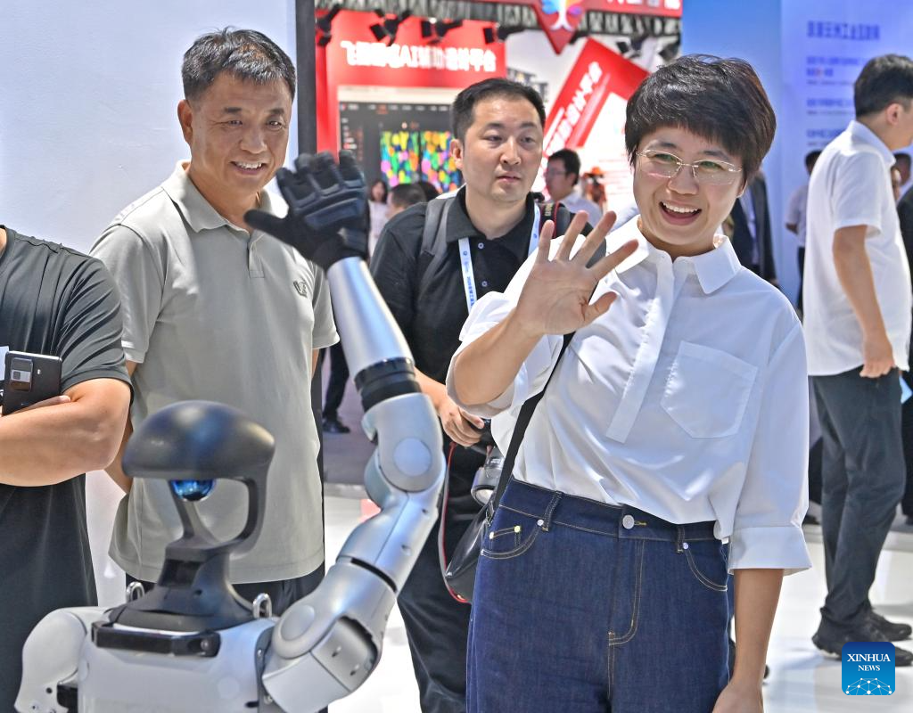 A visitor interacts with a robot at the exhibition area of the 2025 Global Industrial Internet Conference in Shenyang, northeast China's Liaoning Province, Sept. 6, 2025. Themed "Digital New Chapter, Intelligent New Quality," the 2025 Global Industrial Internet Conference kicked off here on Saturday and will last till Sept. 8. (Xinhua/Zhou Hua)