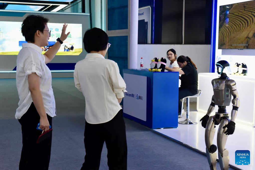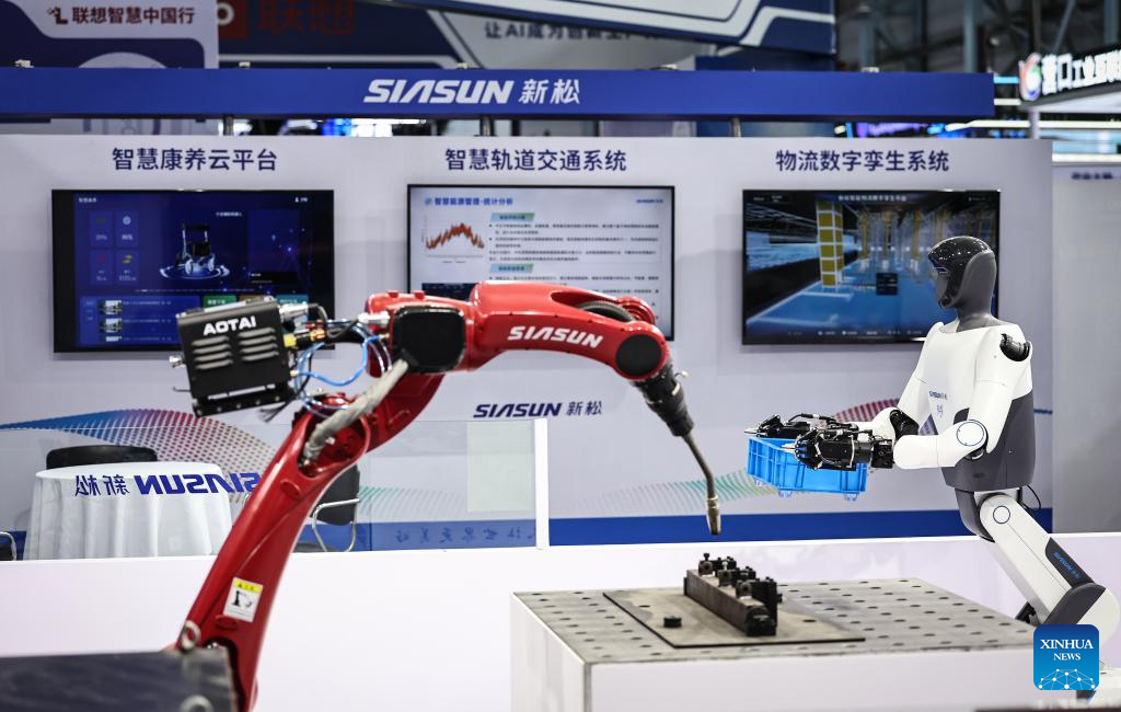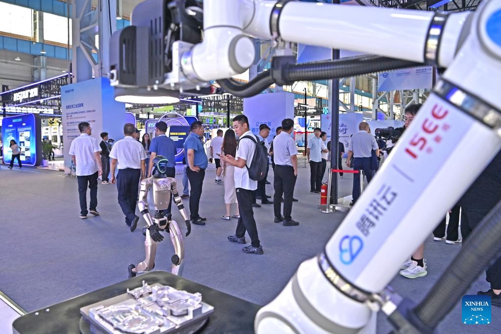 Exhibitors display a robot at the exhibition area of the 2025 Global Industrial Internet Conference in Shenyang, northeast China's Liaoning Province, Sept. 6, 2025. Themed "Digital New Chapter, Intelligent New Quality," the 2025 Global Industrial Internet Conference kicked off here on Saturday and will last till Sept. 8. (Xinhua/Pan Yulong)
