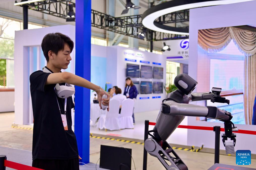An exhibitor controls a robot at the exhibition area of the 2025 Global Industrial Internet Conference in Shenyang, northeast China's Liaoning Province, Sept. 6, 2025. Themed "Digital New Chapter, Intelligent New Quality," the 2025 Global Industrial Internet Conference kicked off here on Saturday and will last till Sept. 8. (Photo by Wang Yuyan/Xinhua)