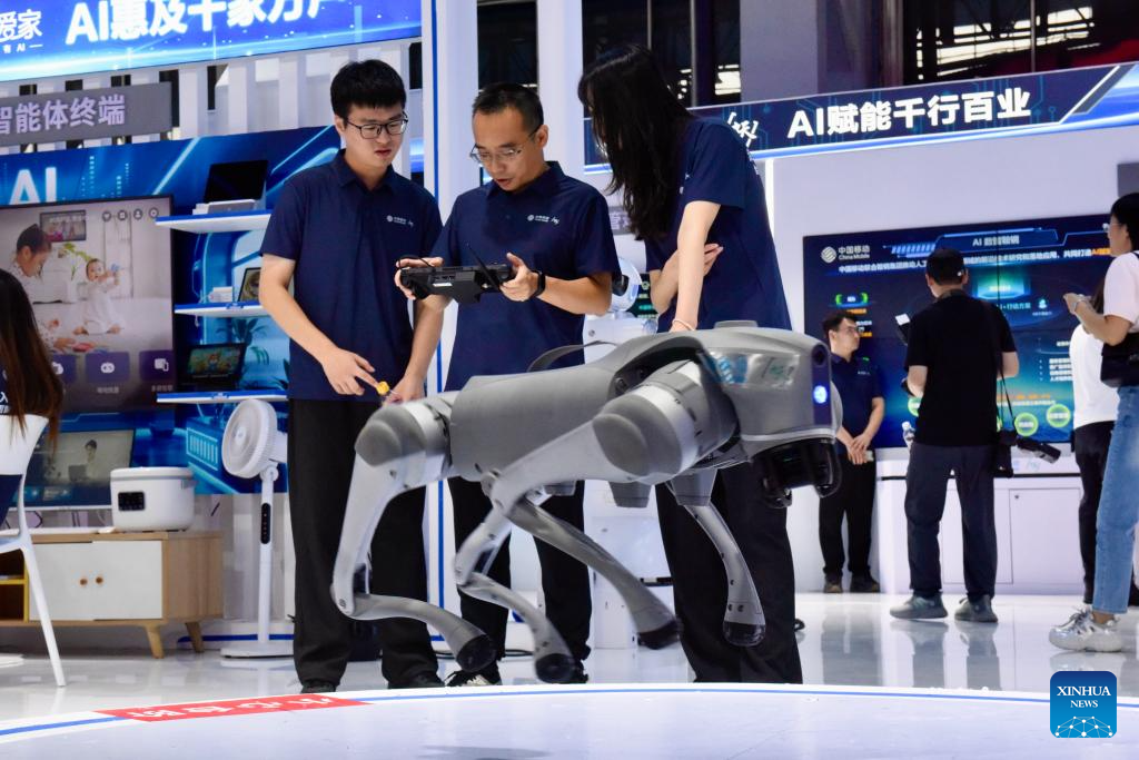 Staff members of China Mobile adjust a robot dog at the exhibition area of the 2025 Global Industrial Internet Conference in Shenyang, northeast China's Liaoning Province, Sept. 7, 2025. Themed "Digital New Chapter, Intelligent New Quality," the 2025 Global Industrial Internet Conference kicked off here on Saturday and will last till Sept. 8. (Photo by Wang Yuyan/Xinhua)