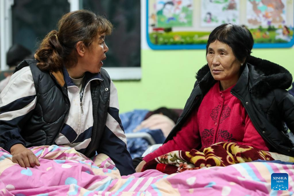 Quake-affected residents talk at a temporary shelter in Xianjiamen Village in Wenfeng Township of Longxi County, northwest China's Gansu Province, Sept. 27, 2025.