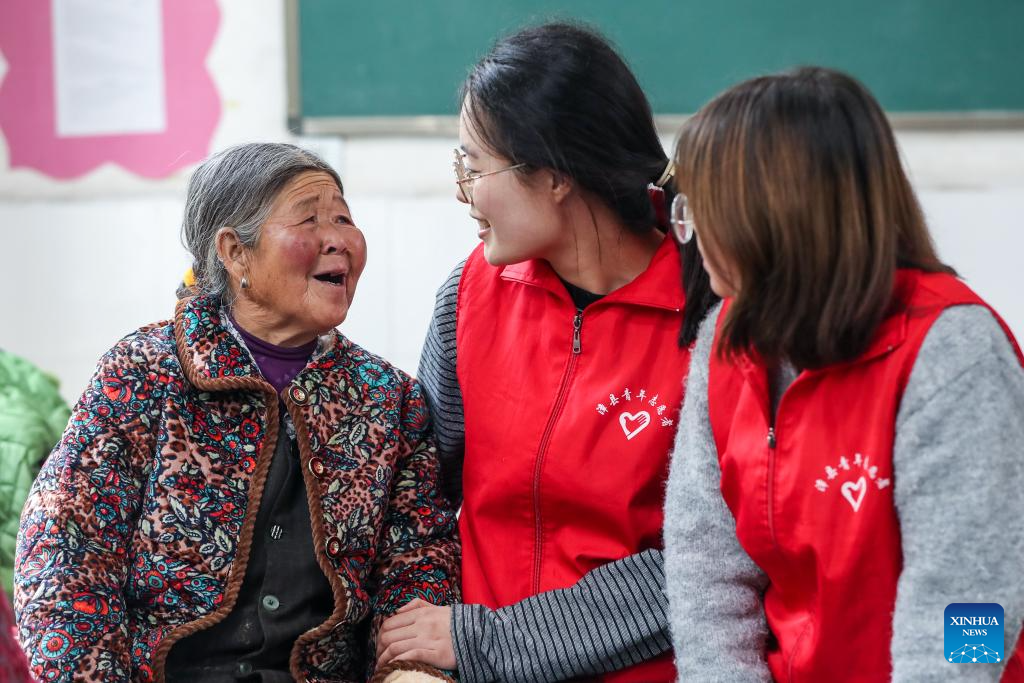 Volunteers chat with a quake-affected resident at a relocation site in Zhangxian County, Dingxi City, northwest China's Gansu Province, Sept. 28, 2025.(Xinhua/Lang Bingbing)
