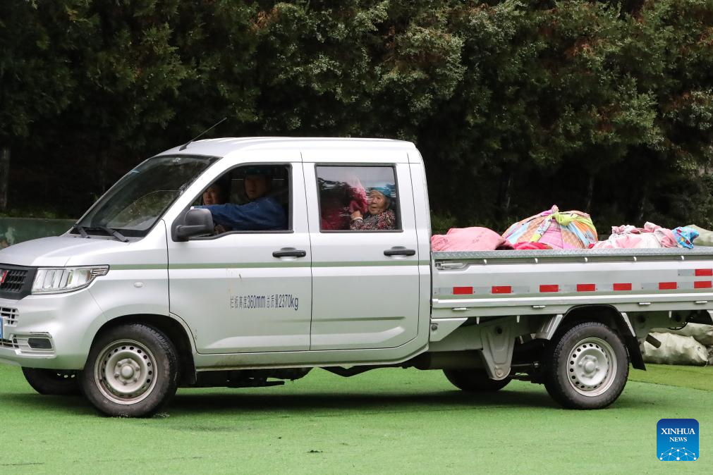 A vehicle transporting relocated quake-affected residents is pictured at a relocation site in Zhangxian County, Dingxi City, northwest China's Gansu Province, Sept. 28, 2025.(Xinhua/Lang Bingbing)