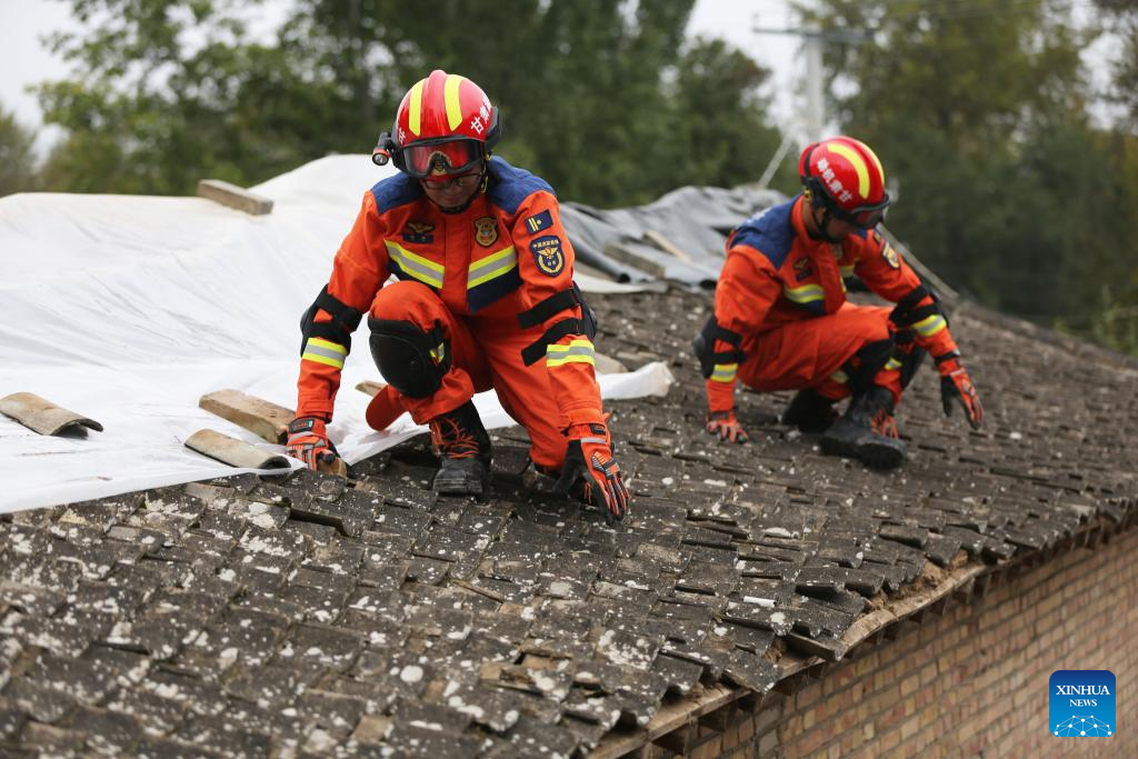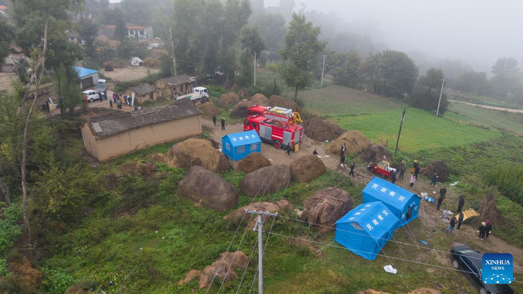 Rescuers conduct risk inspections at Hualin Village of Wenfeng Town in Longxi County, Dingxi City, northwest China's Gansu Province, Sept. 27, 2025. A 5.6-magnitude earthquake struck Longxi County in Dingxi City in northwest China's Gansu Province at 5:49 a.m. Saturday, the China Earthquake Networks Center (CENC) said. (Photo by Wang Kexian/Xinhua)