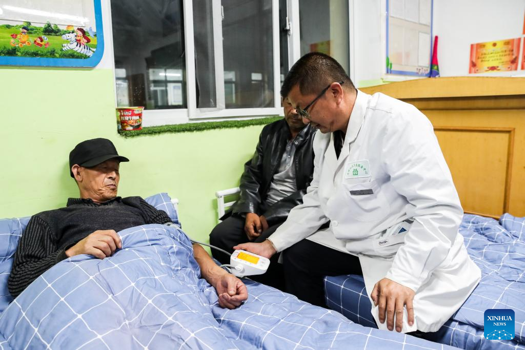 Medical personnel measure blood pressure for a quake-affected resident at a relocation site in Zhangxian County, Dingxi City, northwest China's Gansu Province, Sept. 28, 2025.(Xinhua/Lang Bingbing)