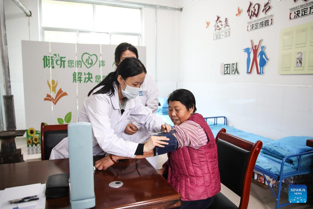 A medical worker measures blood pressure for a quake-affected resident at a temporary shelter in Xianjiamen Village in Wenfeng Township of Longxi County, northwest China's Gansu Province, Sept. 27, 2025.