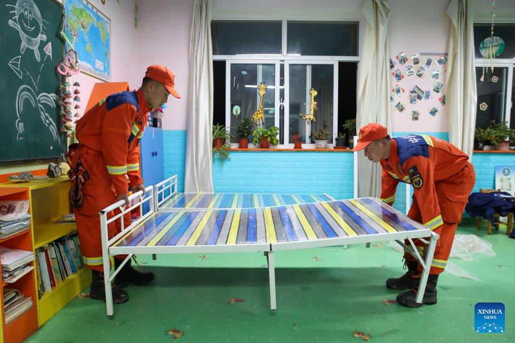 Rescuers set up beds at a temporary shelter in Xianjiamen Village in Wenfeng Township of Longxi County, northwest China's Gansu Province, Sept. 27, 2025.