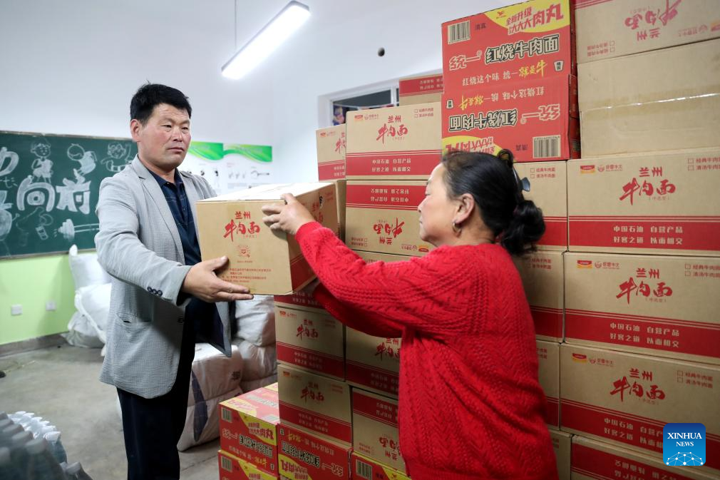 A quake-affected resident (R) takes relief supplies at a temporary shelter in Xianjiamen Village in Wenfeng Township of Longxi County, northwest China's Gansu Province, Sept. 27, 2025.