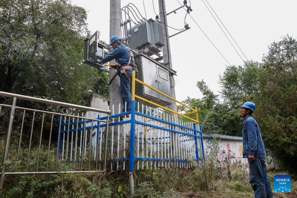 Power personnel inspect the power supply facilities at a relocation site in Zhangxian County, Dingxi City, northwest China's Gansu Province, Sept. 28, 2025.(Xinhua/Lang Bingbing)