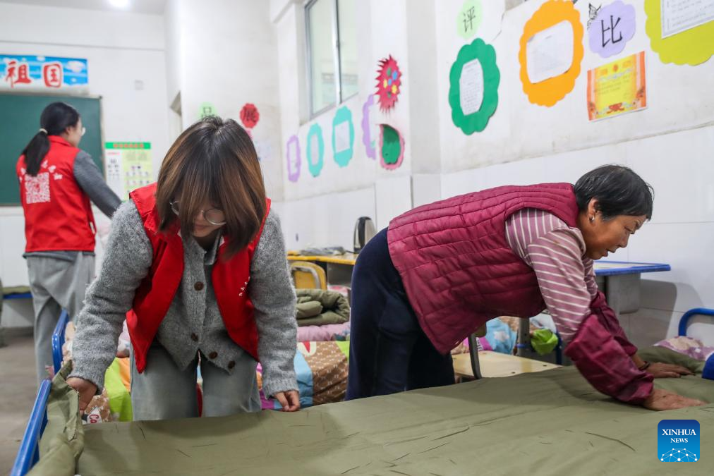 Volunteers help the quake-affected people make the beds at a relocation site in Zhangxian County, Dingxi City, northwest China's Gansu Province, Sept. 28, 2025.(Xinhua/Lang Bingbing)