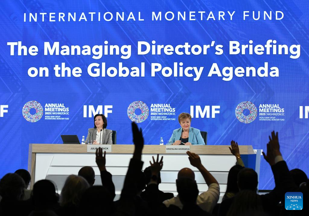 International Monetary Fund (IMF) Managing Director Kristalina Georgieva (R) takes questions at the managing director's briefing on the Global Policy Agenda in Washington, D.C., the United States, Oct. 16, 2025. (Xinhua/Li Rui)
