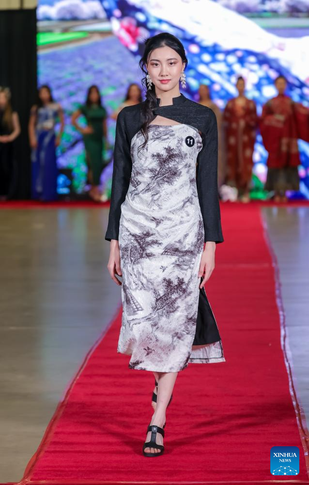 A competitor participates in the final of San Francisco Division of 2025 Miss International Fashion Travel Pageant in San Jose of San Francisco Bay Area, the United States, Oct. 19, 2025. (Photo by Dong Xudong/Xinhua)