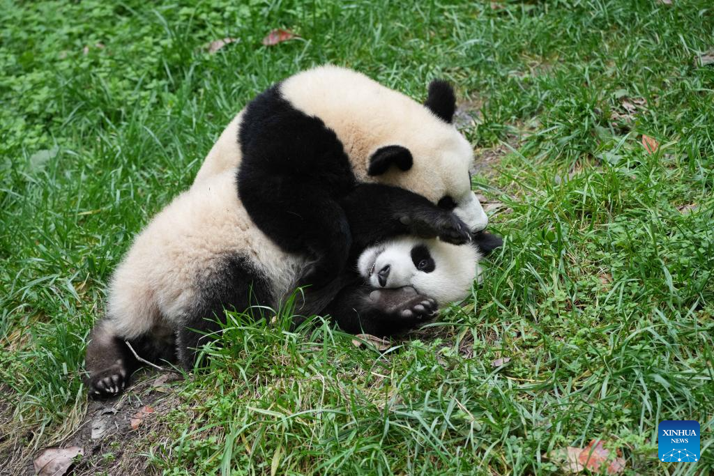 Giant panda "Can Yang" (top) frolics with giant panda "Qing Yang" at the Shenshuping giant panda base of Wolong National Nature Reserve in southwest China's Sichuan Province, Nov. 6, 2025. (Xinhua/Xu Bingjie)