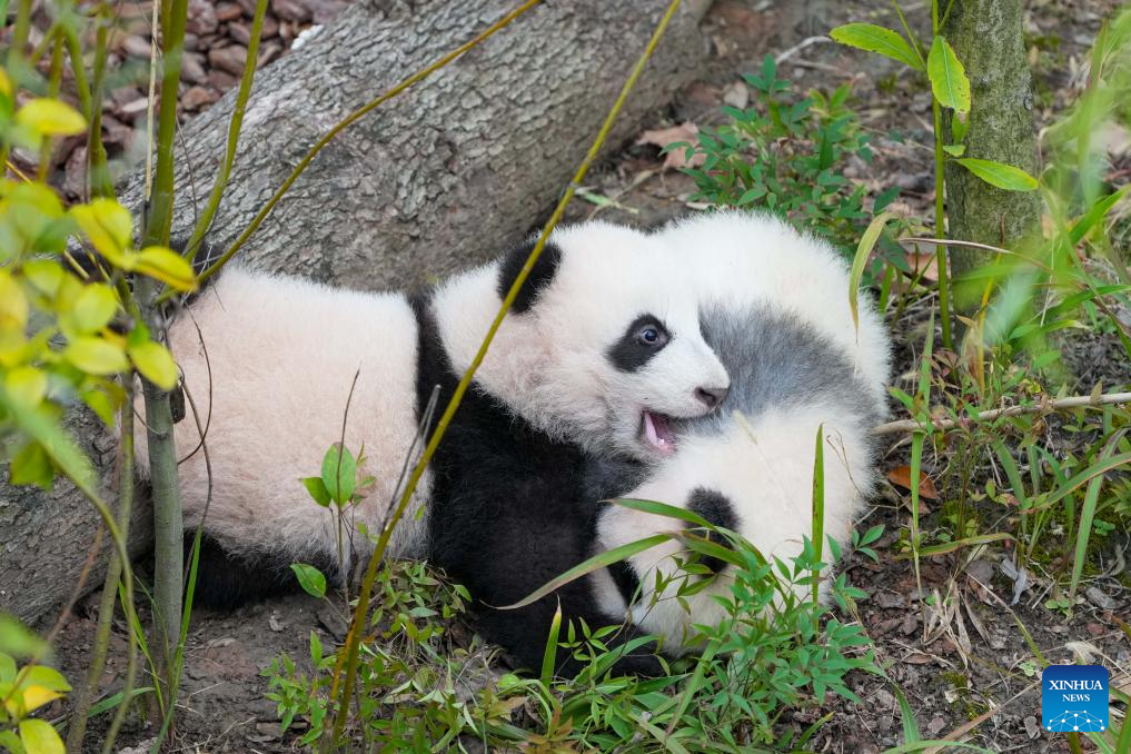 Giant panda cubs frolic at Chengdu Research Base of Giant Panda Breeding in Chengdu, southwest China's Sichuan Province, Oct. 30, 2025. (Xinhua/Xu Bingjie)