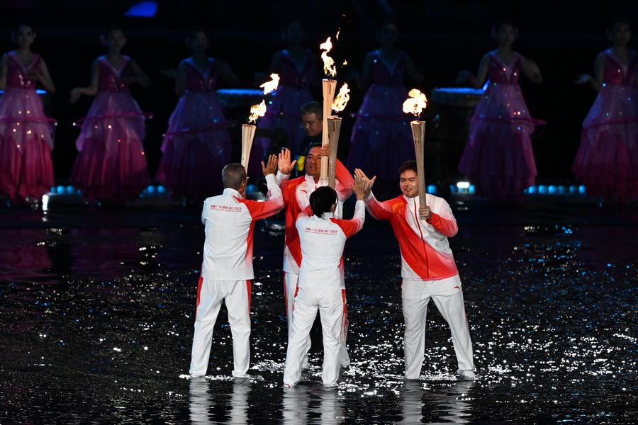 The cauldron was lit jointly by the final torchbearers: Guangdong sprinter Su Bingtian, Hong Kong Olympic fencing champion Cheung Ka Long and Macao Asian Games wushu gold medalist Li Yi.